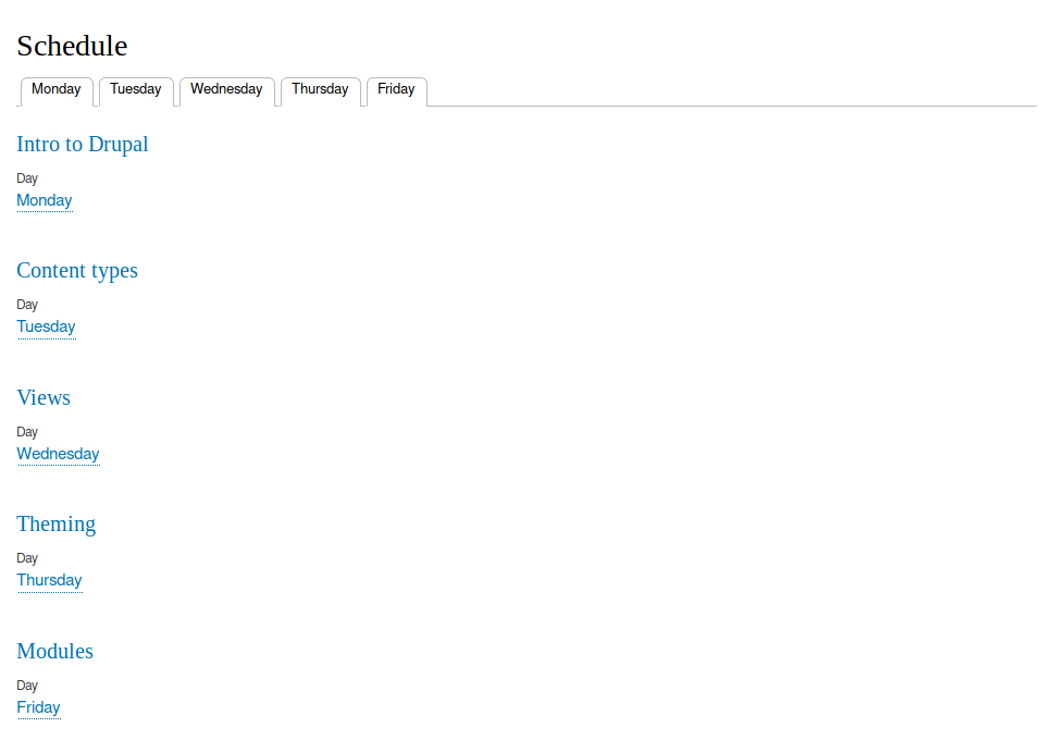 We're going to build a simple schedule, with tabs for days of the week. Let's say you are building a site for an upcoming 1 week Drupal course you're teaching.