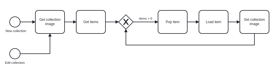 ECA workflow using the BPMN UI. This fires after a Collection is added/updated, loads referenced items, and sets the collection image field on each one to the referenced media.