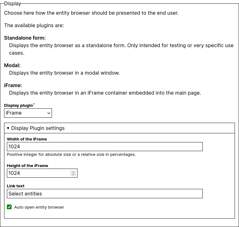 Core module Disabled Module page https://www.drupal.org/project/entity_browser Module tags Enhancement Needs work Tags Content Provides a UI for selecting embedded/referenced entities, similar to media library. There are some issues with configuring it, with some broken features that prevent creating a streamlined UI. For embedded entities, compare with making a plugin. Display settings for ckeditor embed button. Image IssuesError: Used entity browser selection display cannot work in combination with settings defined for used selection widgetValidate widget entity type and bundlesAutomatically submit selection skips field validation in View widgetRelated issuesQuestionsRelated modulesDropzoneJSEntity EmbedInline Entity FormContent BrowserFile BrowserCkeditor5 Entity BrowserResourcesArticlesChange recordsProject updatesEmbedding Code SampleTips